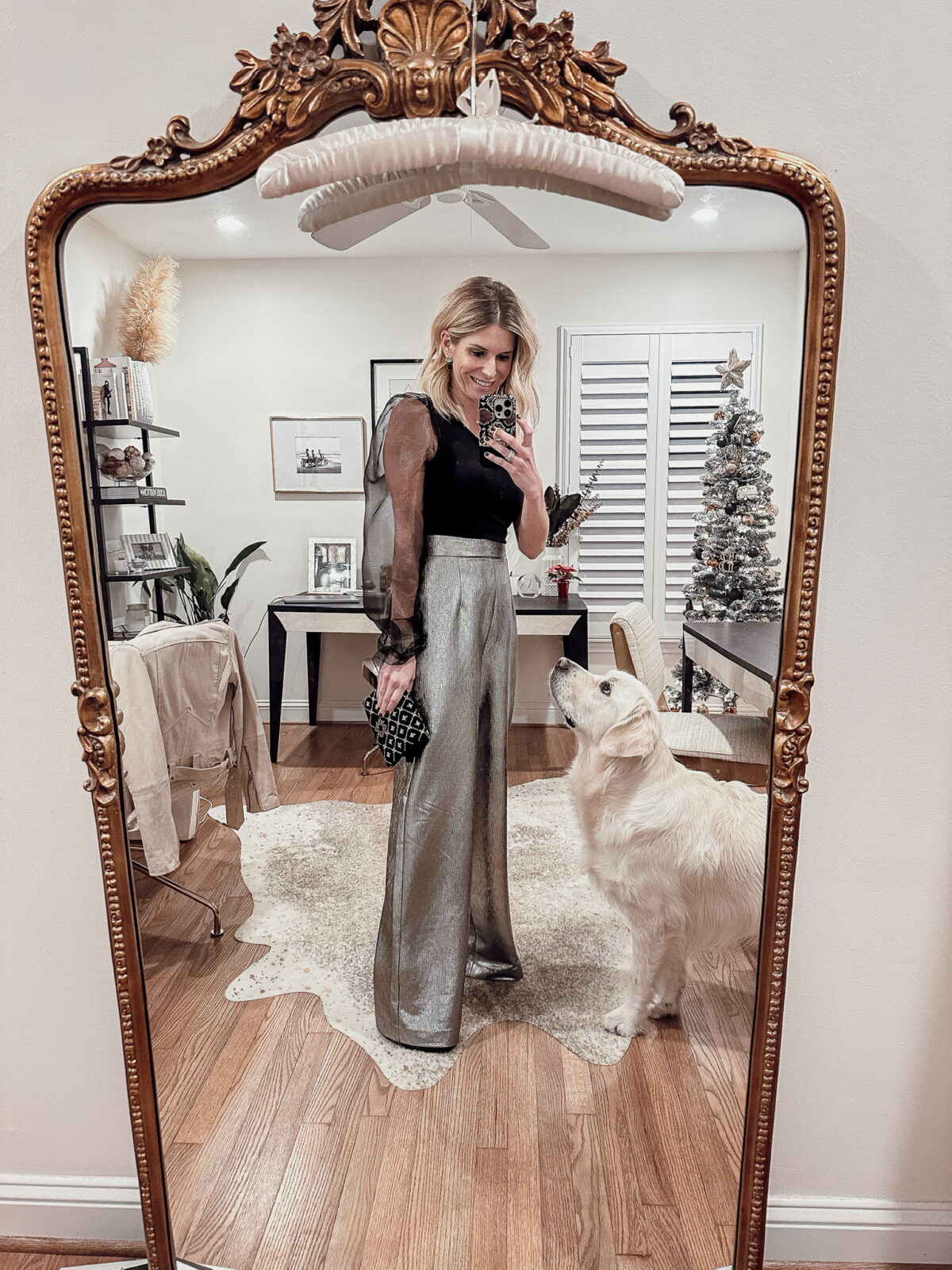 Silver pants meet sleek black satin for a look that’s both bold and sophisticated. The metallics bring a fun, modern edge. Ideal for any outfit where you want to make it come alive.