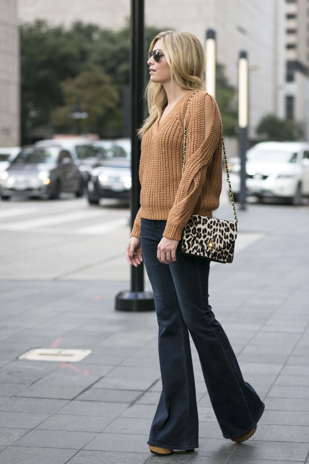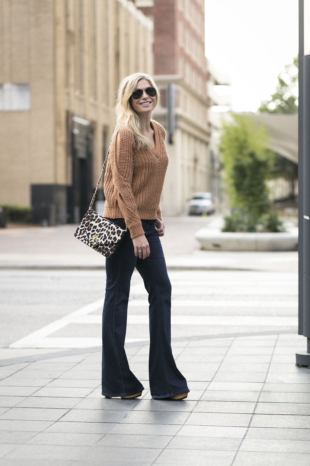 Tan Chunky Sweater (another here) // Dark Flare Jeans // Tory Burch Leopard Purse (old; similar) // Block Heel Sandals (old; new favorites) // Sunglasses