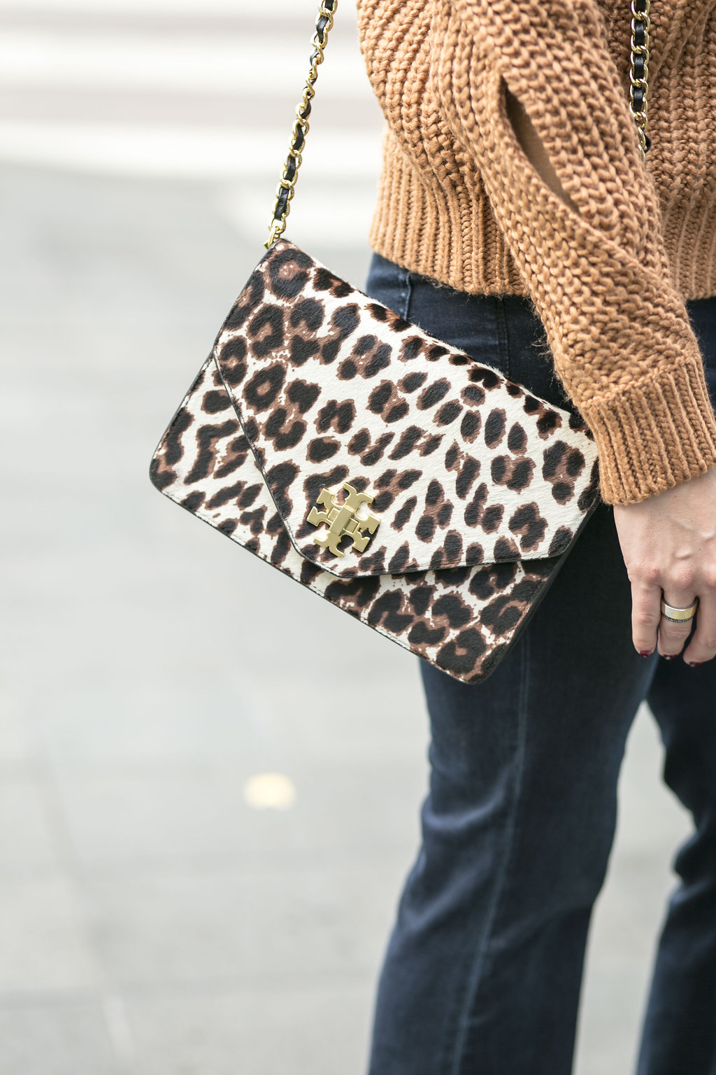 You may notice I wear skinny jeans quite a bit because I have little chicken legs, but I forgot about these amazing dark denim flare jeans I got last season. I thought the dark jeans would make the sweater stand out better in this outfit. Then I got stumped when I was trying to choose what color purse would look best with this outfit. Tip: leopard is a great alternative to neutrals! Unfortunately, my leopard purse is a few years old, but I found a new Tory Burch leopard purse that is worth the investment this fall!