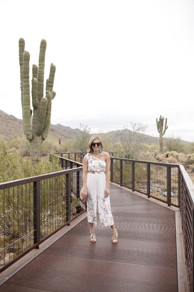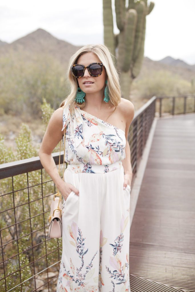 You probably saw me post this one shoulder romper over the weekend on Instagram. Since it was a destination wedding and in the desert, I figured I could get away with this cute romper instead of a dress for the rehearsal dinner. It’s not too casual, and these turquoise earrings make any outfit look stylish for spring or summer! I’m personally a huge fan of rompers and jumpsuits because I have a short torso so they make my body look elongated.