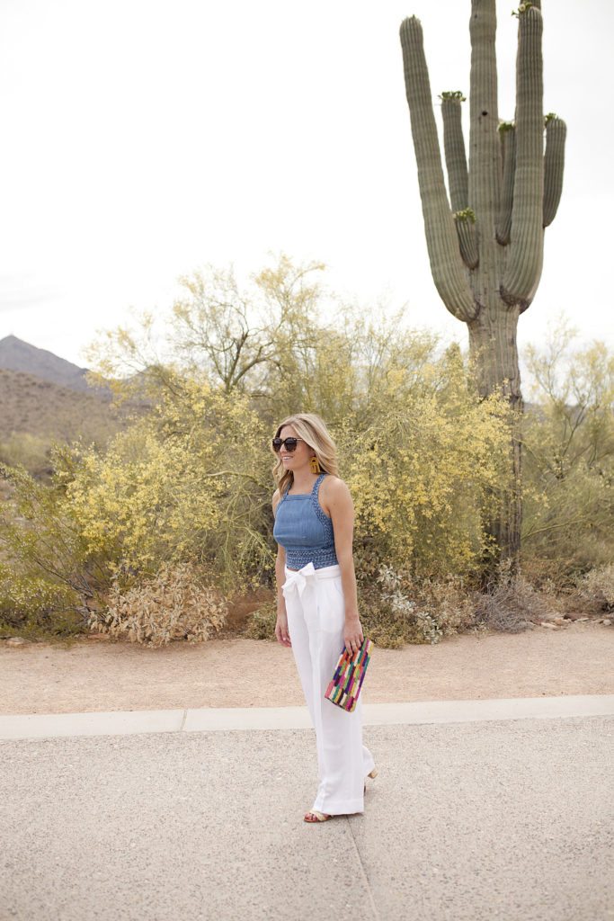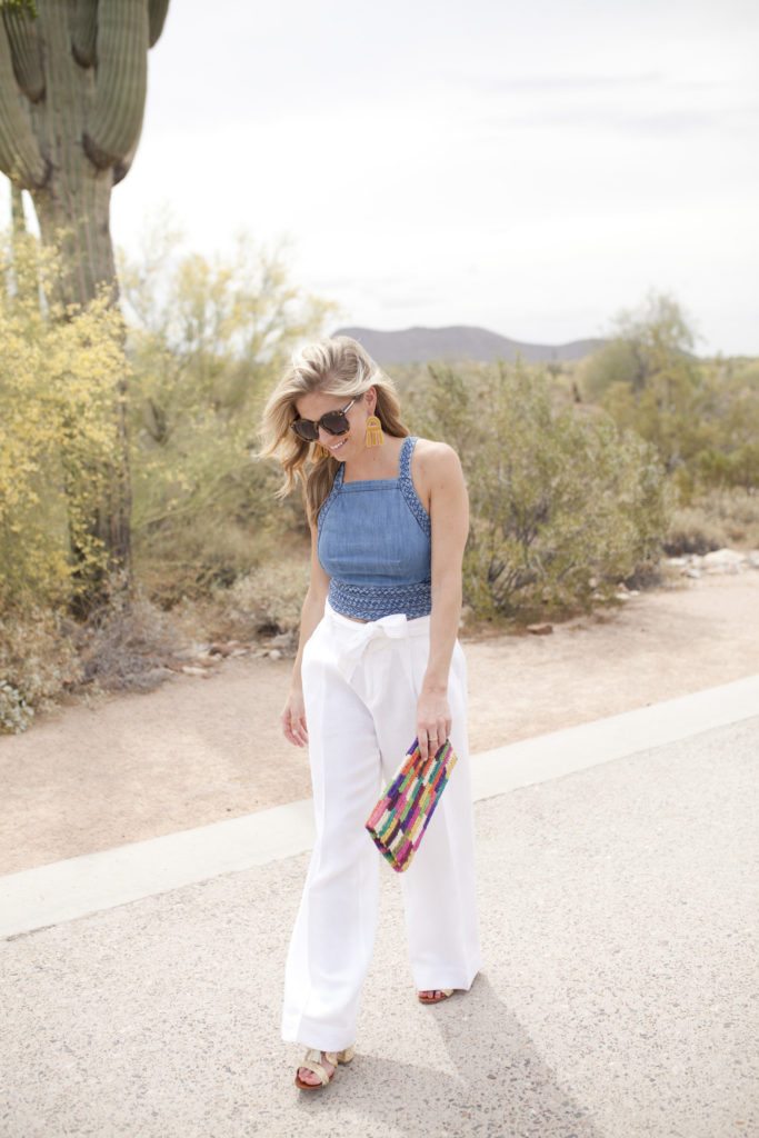 This outfit was planned for a post wedding brunch, but that didn’t happen… I should’ve figured, haha. Considering I was with my best friends from back home in Oklahoma and my besties from Dallas there was a heavy amount of wine flowing the entire weekend. However, I am so in love with this denim crop top. I’m not normally a fan of crop tops because I don’t like to show off my mid section. The braided detail with bow tie on the back of this top are SO amazing that I decided to go for it and buy it. By wearing the top with these high waisted white linen pants it solved the problem of my tummy showing at all. Last, how perfect is this gorgeous color block clutch for summer?! I carried it to the wedding with this yellow maxi dress, and it will pretty much go with everything.