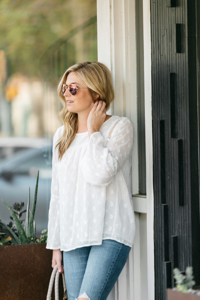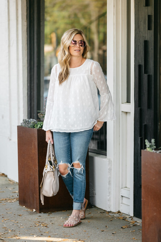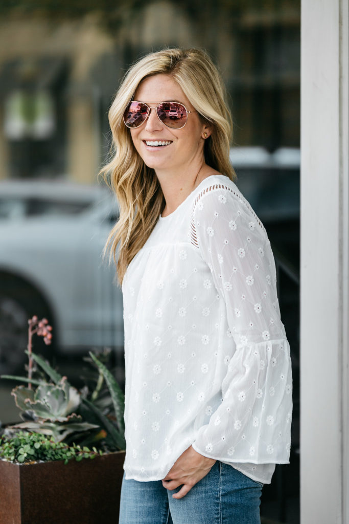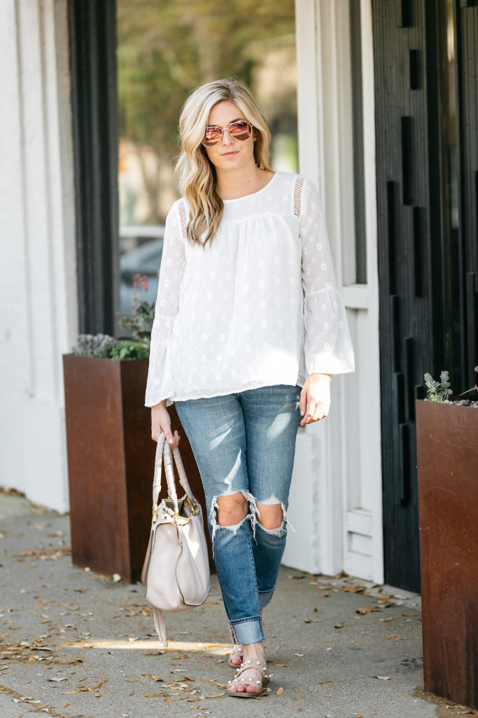 This is an outfit I could wear on repeat! I love dressing up, but I’m definitely a jeans and t-shirt kind of girl. I’ve been living in these distressed skinny jeans (only $88!) if you haven’t noticed by all my Instagram posts. And…let’s just talk about these pearl slides! They sold out in about 2 seconds, but they are back and available for pre-order! I promise they will be worth the wait… Lastly, I’m always a sucker for a good basic white top. This airy bell sleeve blouse is a great transitional top during the spring months.
