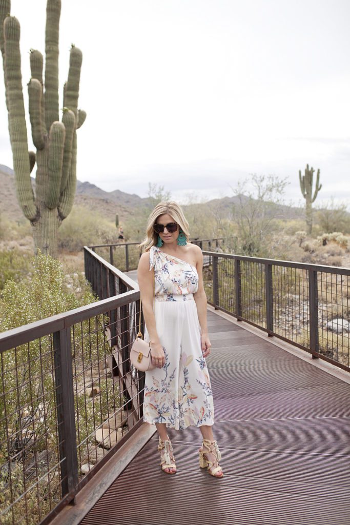 You probably saw me post this one shoulder romper over the weekend on Instagram. Since it was a destination wedding and in the desert, I figured I could get away with this cute romper instead of a dress for the rehearsal dinner. It’s not too casual, and these turquoise earrings make any outfit look stylish for spring or summer! I’m personally a huge fan of rompers and jumpsuits because I have a short torso so they make my body look elongated.